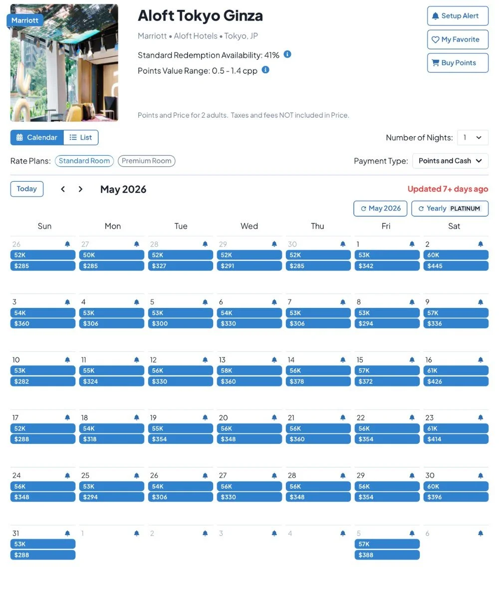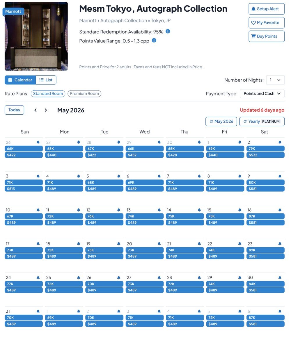 After a quick comparison, the cheapest 5-night stretch at The Ritz-Carlton Tokyo is May 4–9 at 506.5k. For Mesm Tokyo, May 3-8 at 282k. For Aloft Tokyo Ginza, May 3-8 at 214k.