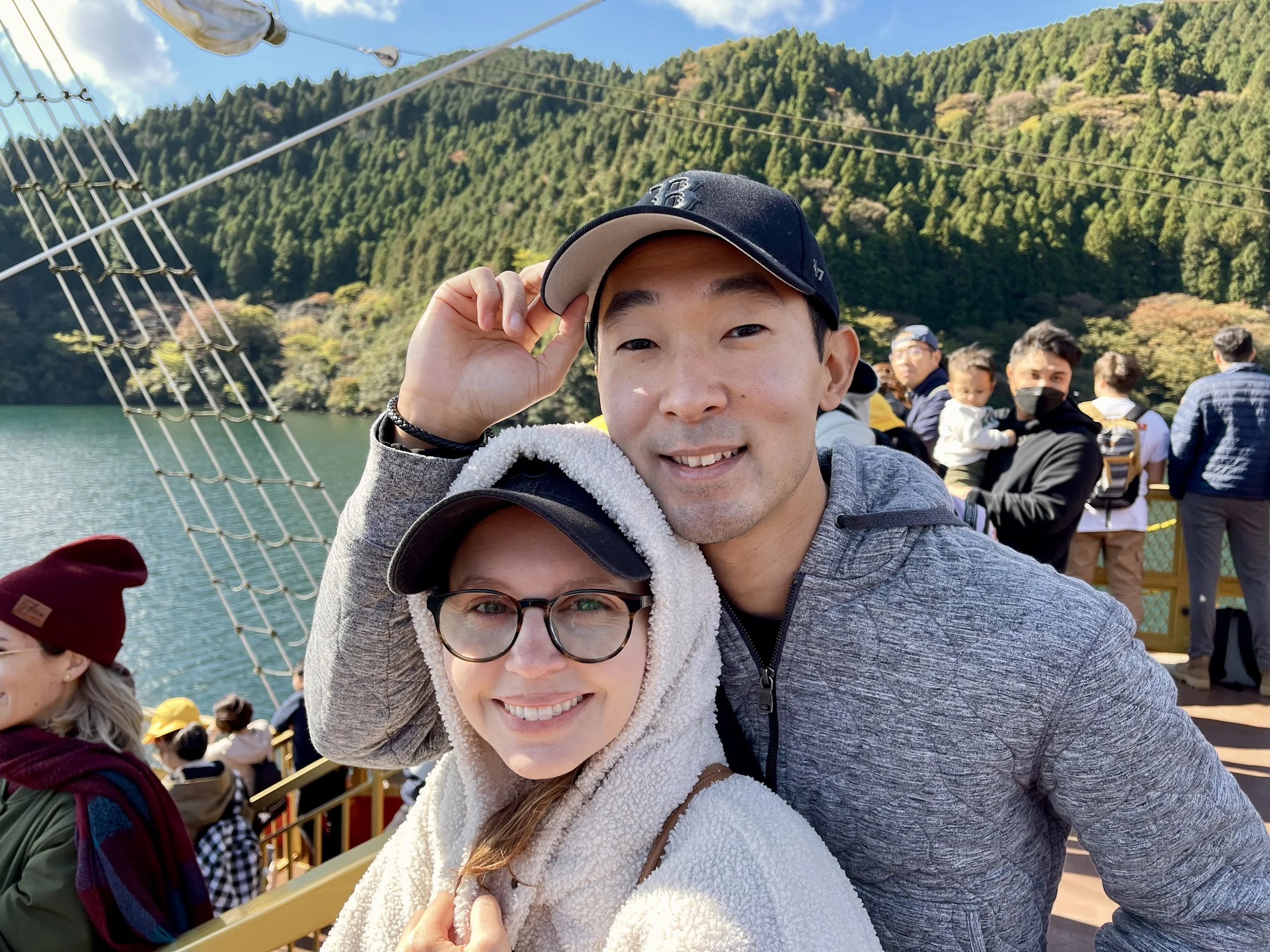 On the famouns pirate ship in Hakone, getting some fresh air with Cory