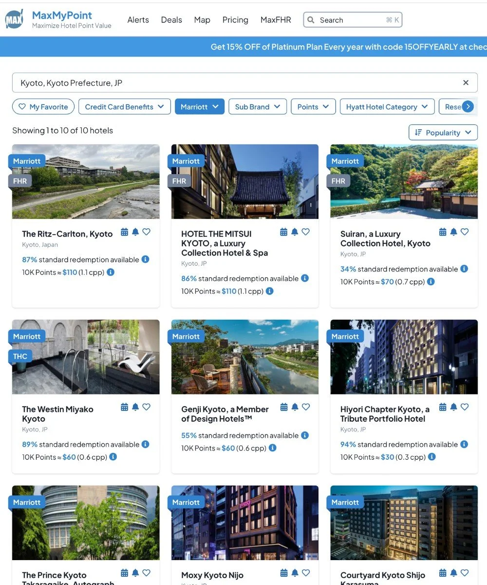 Much like in Tokyo, you immediately see three categories: The Ritz-Carlton Kyoto (very similar value to The Ritz-Carlton Tokyo), The Westin Kyoto (maybe a touch below Mesm Tokyo but close enough), and Genji Kyoto (Aloft Tokyo level).