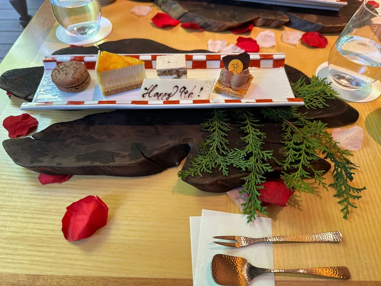 The two waitresses dressed in kimono threw rose petals into the air and sang, “Happy 9th anniversary!” (We all exchanged a funny chuckle at the unexpected celebration)
