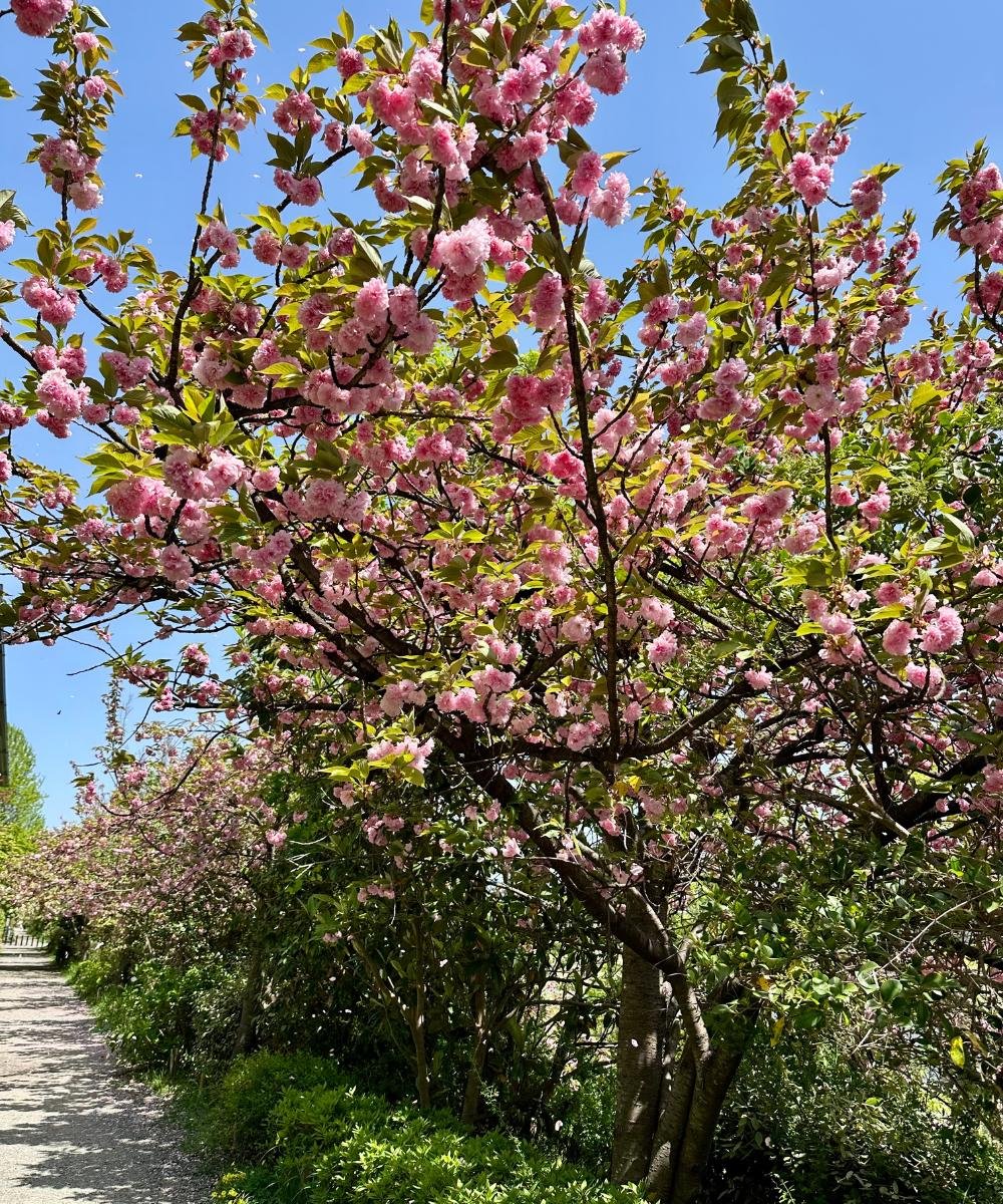 Cherry blossom trees line the pathway right below our room